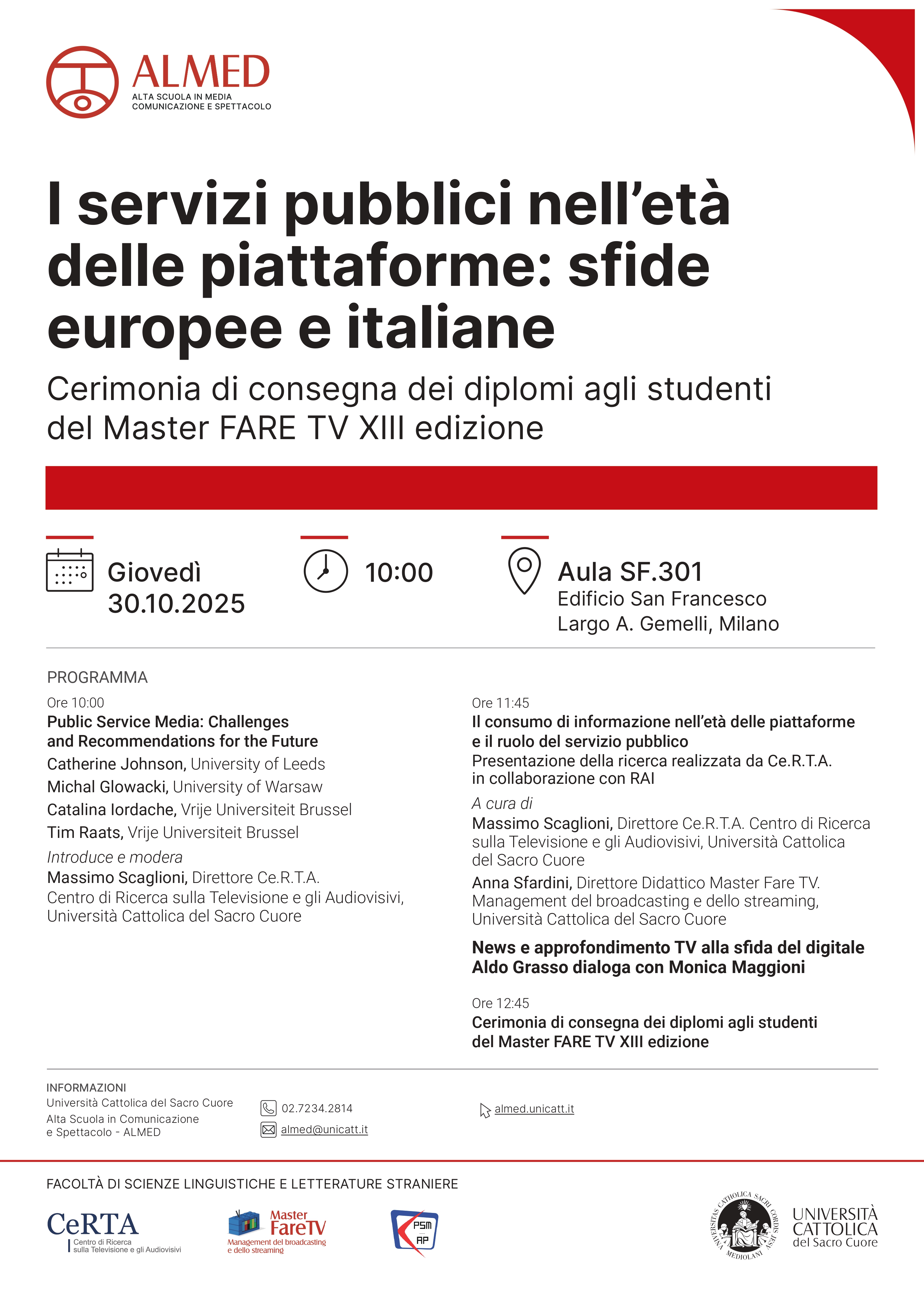 Giovedì 30 ottobre alle ore 10:00 presso l’Aula SF. 301 dell’Università Cattolica del Sacro Cuore di Milano è in programma l’evento “I servizi pubblici nell’età delle piattaforme: sfide europee e italiane”, organizzato dal Ce.R.T.A. – Centro di Ricerca sulla Televisione e gli Audiovisivi e dall’Alta Scuola in Media, Comunicazione e Spettacolo (ALMED) in occasione della cerimonia di consegna dei diplomi agli studenti del Master Fare TV – Management del broadcasting e dello streaming XIII edizione.