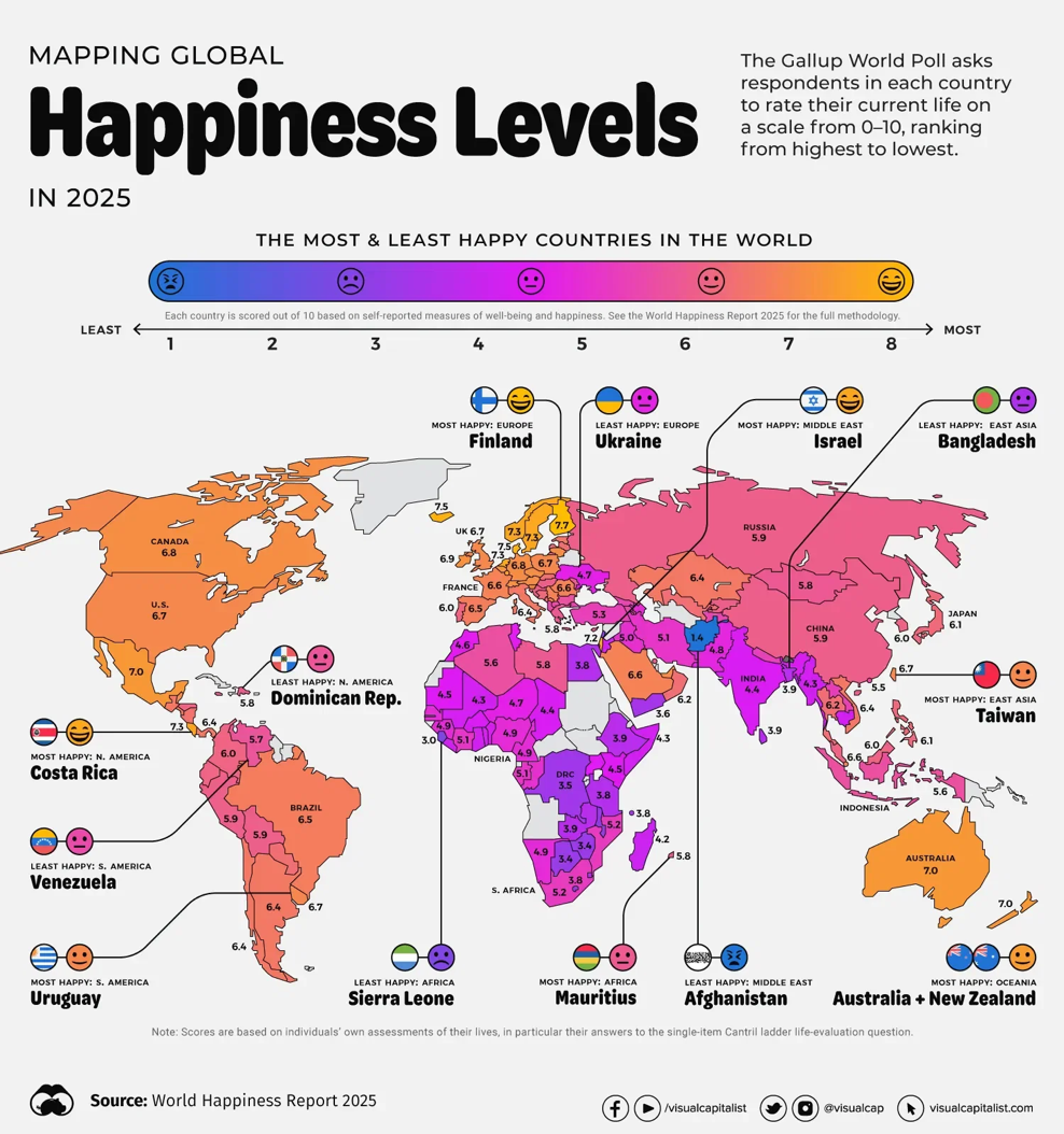 - Mappa i Paesi più felici 2025: evidenzia la Finlandia in cima e la forte presenza di paesi nordici e alcuni non-occidentali nel top 10.