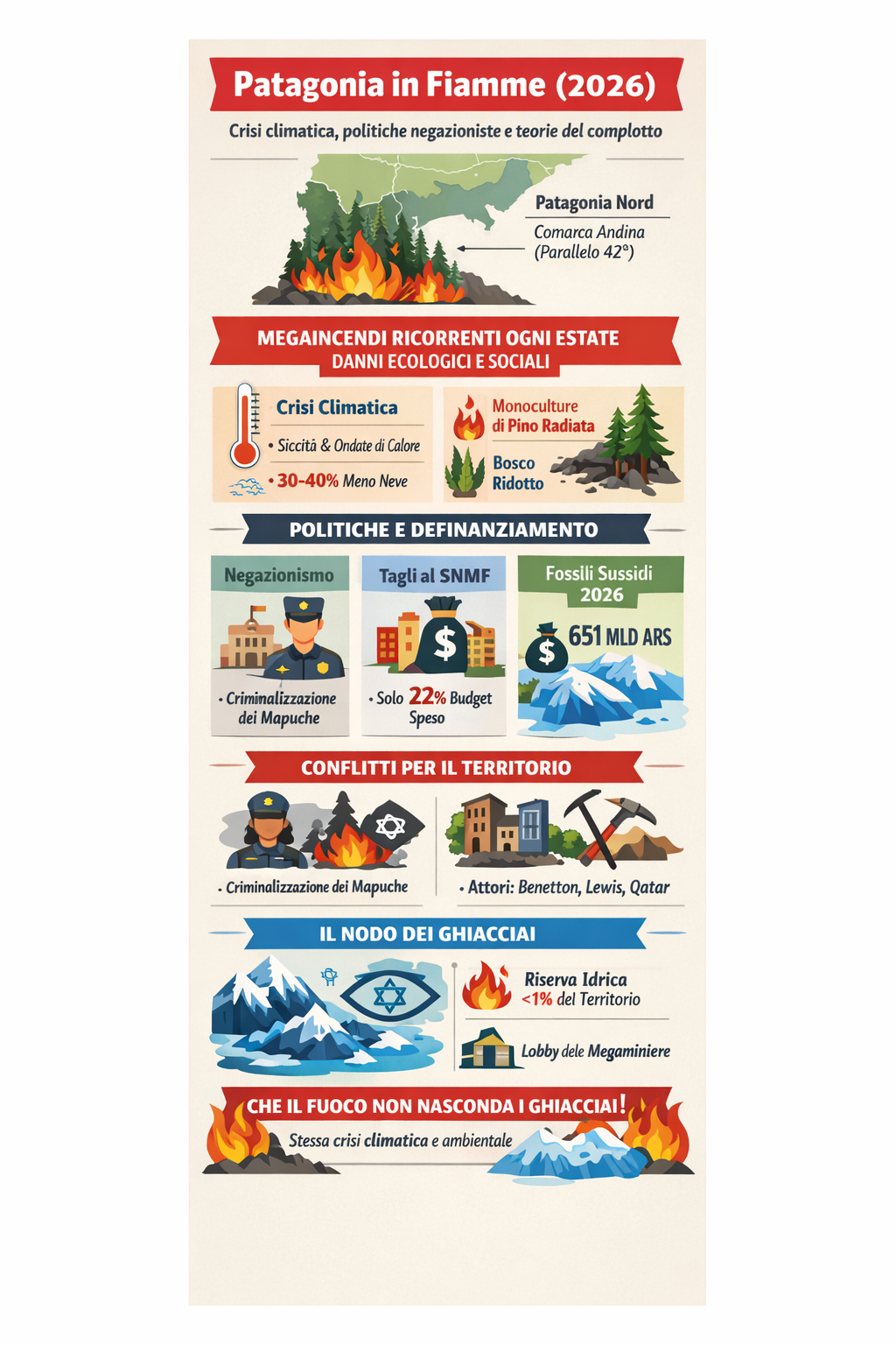 Gli autori sottolineano che gli incendi non devono far perdere di vista una battaglia ambientale cruciale: la difesa dei ghiacciai e delle aree periglaciali, ossia le riserve d’acqua. Il governo Milei nega la crisi climatica, definanzia le istituzioni, promuove l’estrattivismo minerario e punta a modificare in Senato – il 10 febbraio – la Legge sui Ghiacciai, per consentire attività mineraria in aree protette.