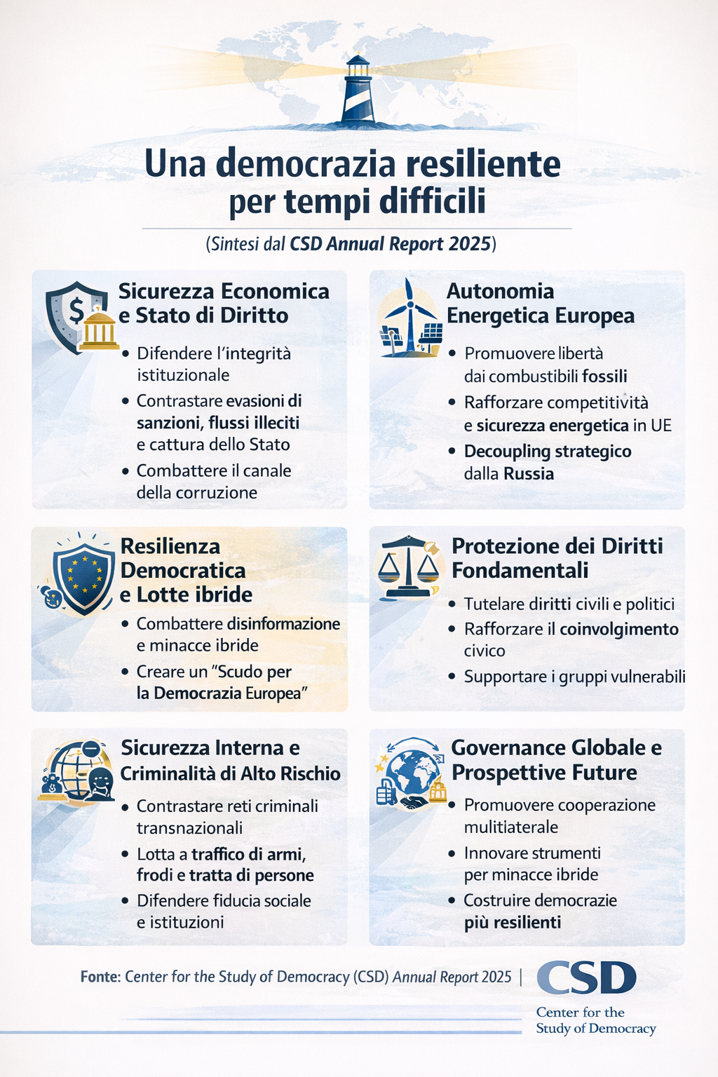 Il CSD Annual Report 2025 si apre con una riflessione di fondo: la democrazia oggi è messa sotto pressione non da singoli problemi, ma da un intreccio di rischi economici, geopolitici e istituzionali. I fattori di rischio non procedono più in parallelo, ma si intrecciano tra loro, con impatti profondi sulla qualità delle istituzioni e sulla fiducia pubblica nelle democrazie. L’approccio del CSD – istituto di ricerca con sede a Sofia e con un ruolo riconosciuto nella formulazione di policy – è orientato a collegare analisi rigorose e impatto politico, anche attraverso dialoghi con decisori pubblici, società civile e comunità di esperti.